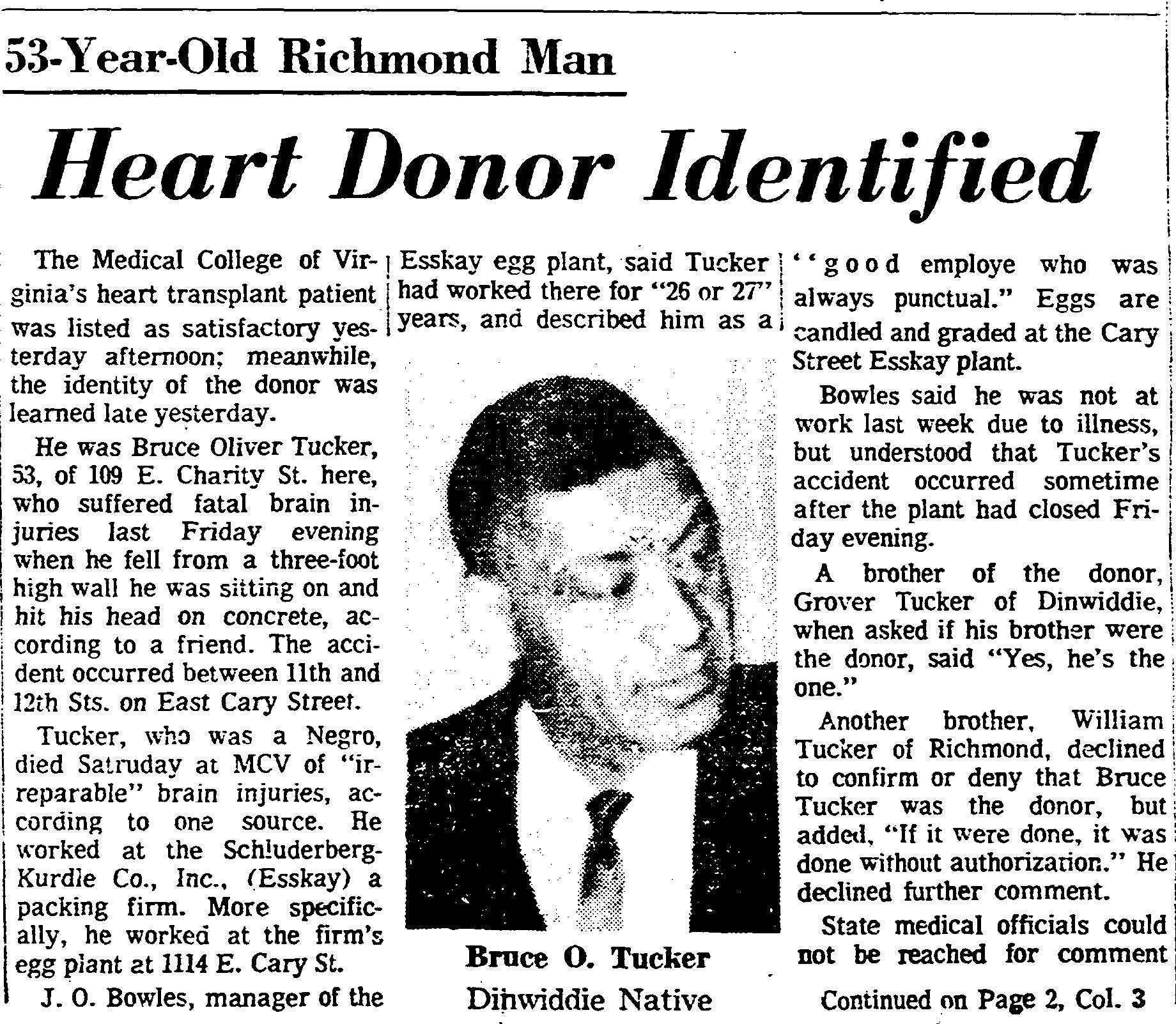 The first human organ transplant, a kidney, took place in 1954. By the 1960s, the human heart transplant was on the medical horizon. On December 3, 1967, a large team led by cardiac surgeon Christiaan Barnard, who had trained in Richmond, VA under Drs. David Hume and Richard Lower, performed the world’s first human-to-human (allogeneic) heart transplant in Capetown, South Africa. On May 25, 1968, an MCV team led by cardiac surgeon Dr. Richard Lower performed the first human-to-human heart transplant in the South. This was the sixteenth heart transplant in the world. The heart of African American Bruce Tucker, who had worked for an egg-packing plant and had recently suffered a severe head injury, deemed by physicians of the time to be an unrecoverable injury, was transplanted into Joseph Klett, a white businessman. Neither Bruce Tucker nor his family consented to the transplant. To learn more about Mr. Tucker's case as well as efforts to honor his legacy, please explore the resources below.